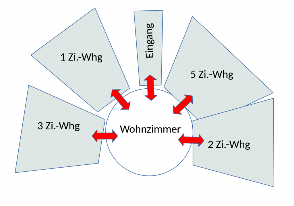 miteinander über den gemeinsamen Wohnbereich im Zentrum verbunden sein.